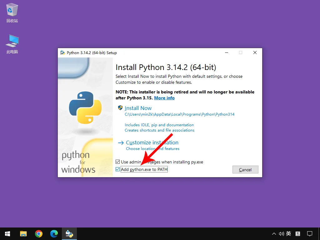 ② 双击运行安装软件后,会弹出以下界面,勾选"Add python.exe to PATH"。